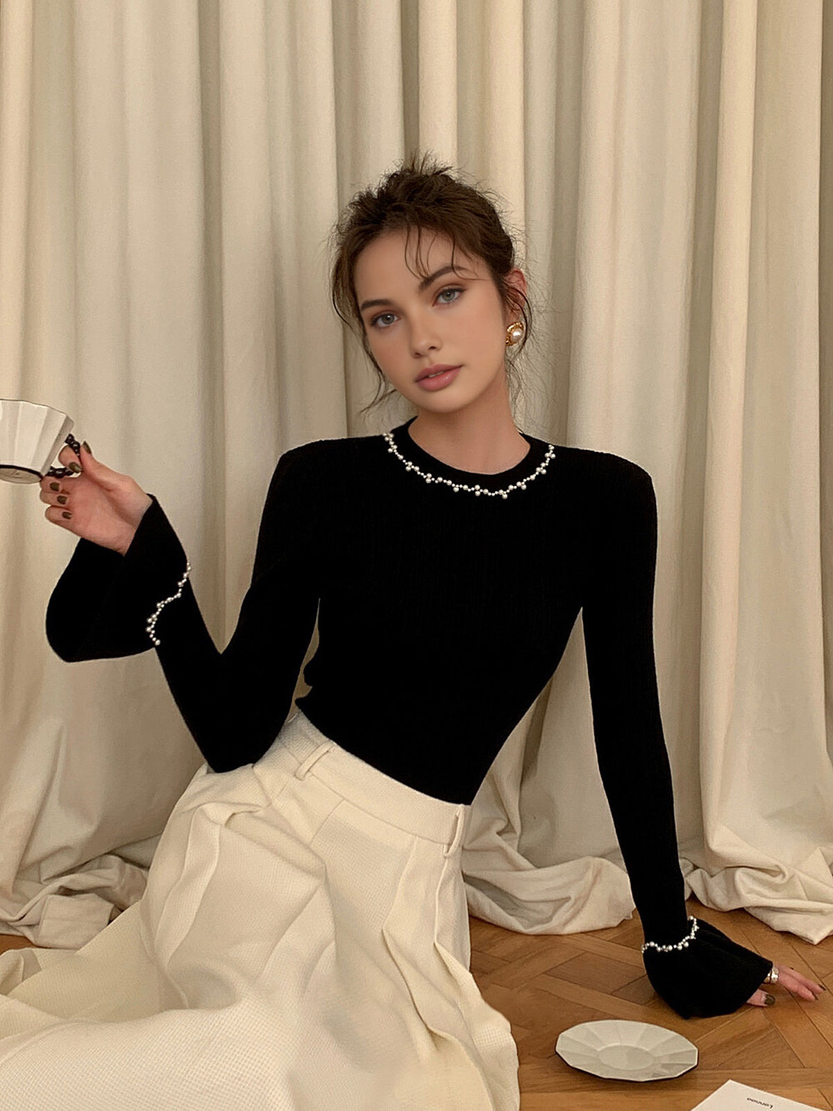 Beaded-Decor Ruffle Knit Top